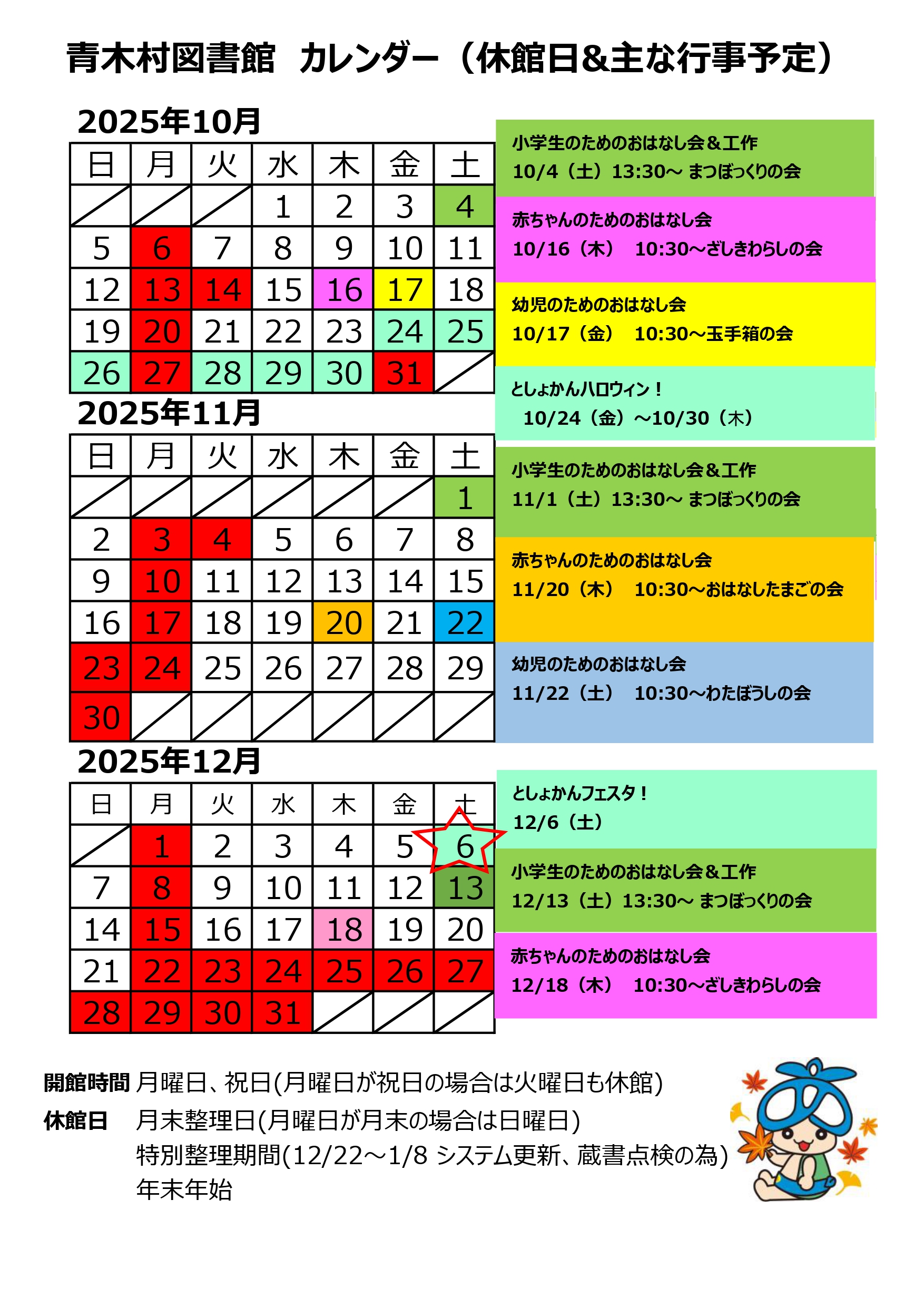月曜日(月曜日が祝日の場合、翌日火曜日も休館)、祝日、毎月末日(末日が月曜日の場合は前日の日曜日も休館)年末・年始、特別整理期間 ※ 詳細は開館カレンダーやお電話でご確認ください。 |