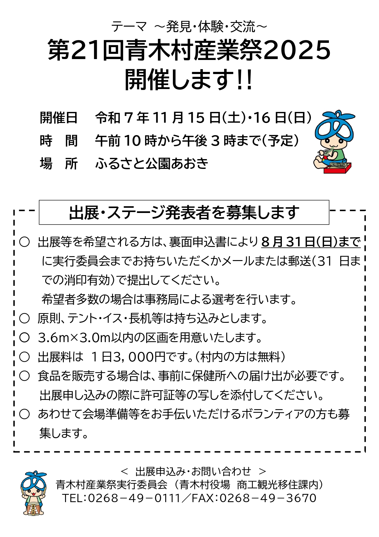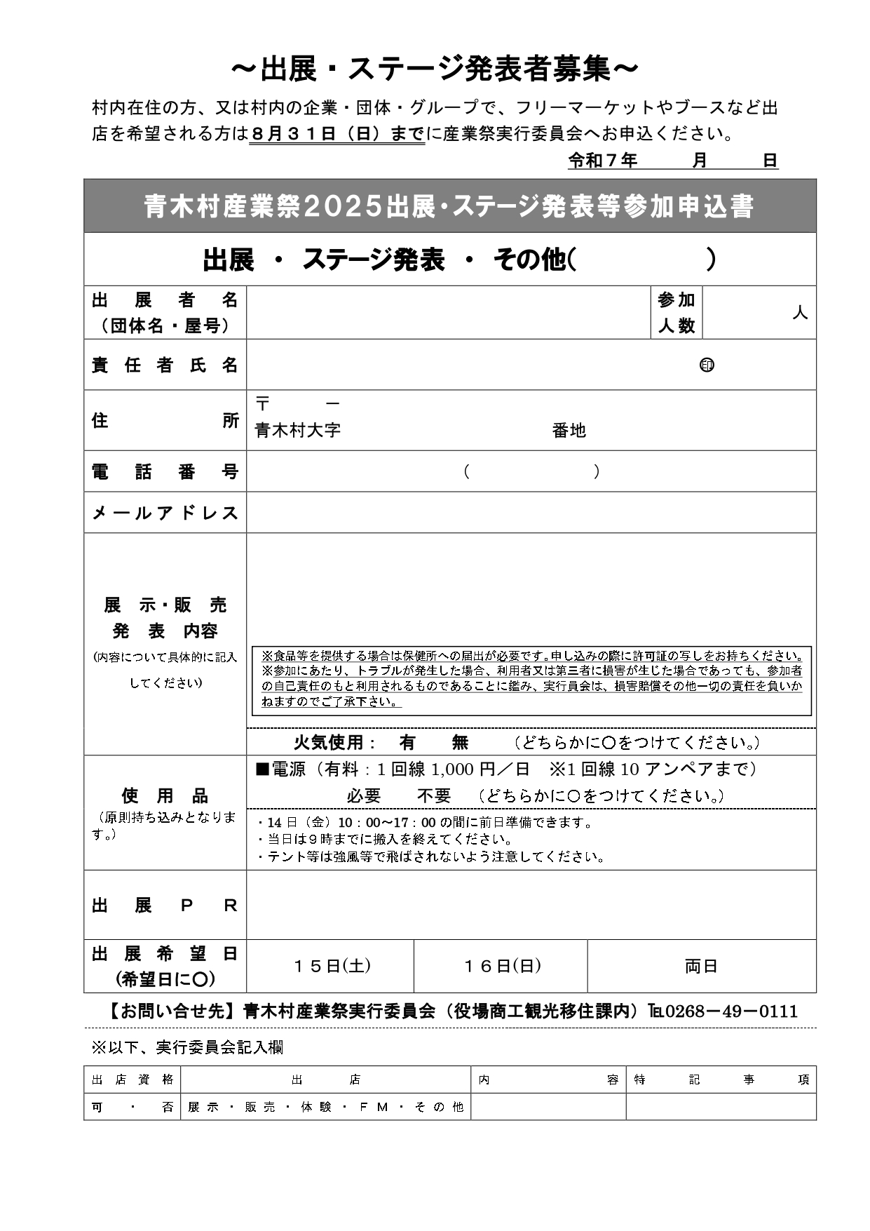 村内在住の方、または村内の企業・団体・グループでフリーマーケットやブース等出展を希望される方は、内容および注意事項を要確認の上、以下の申込書を記入いただき、【青木村産業祭実行委員会(役場商工観光移住課内)TEL:0268-49-0111】へご提出ください。