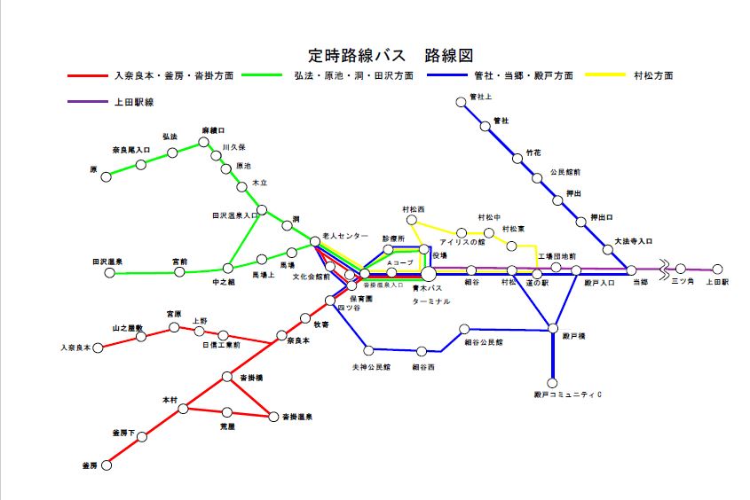 ※千曲バス青木線が青木バスターミナルに到着する時間(10:40頃、11:40頃、12:40頃、13:40頃、17:30頃 着便)は、