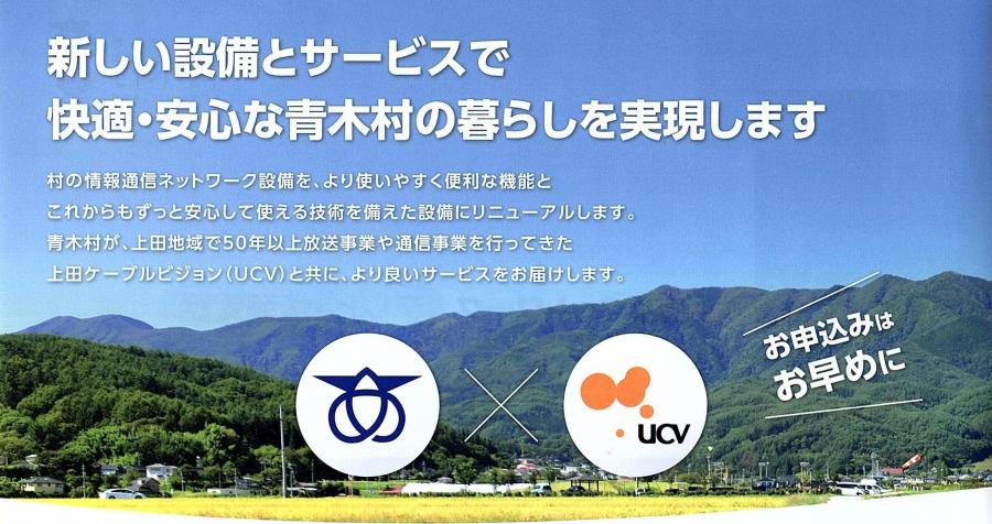テレビはUCVに UCVが制作する多彩な地域の番組を毎日放送。村の学校行事や議会中継などの番組も充実。 新しい「あおきチャンネル」では、データ放送で村のさまざまな生活情報をいつでも簡単に見られます。 |