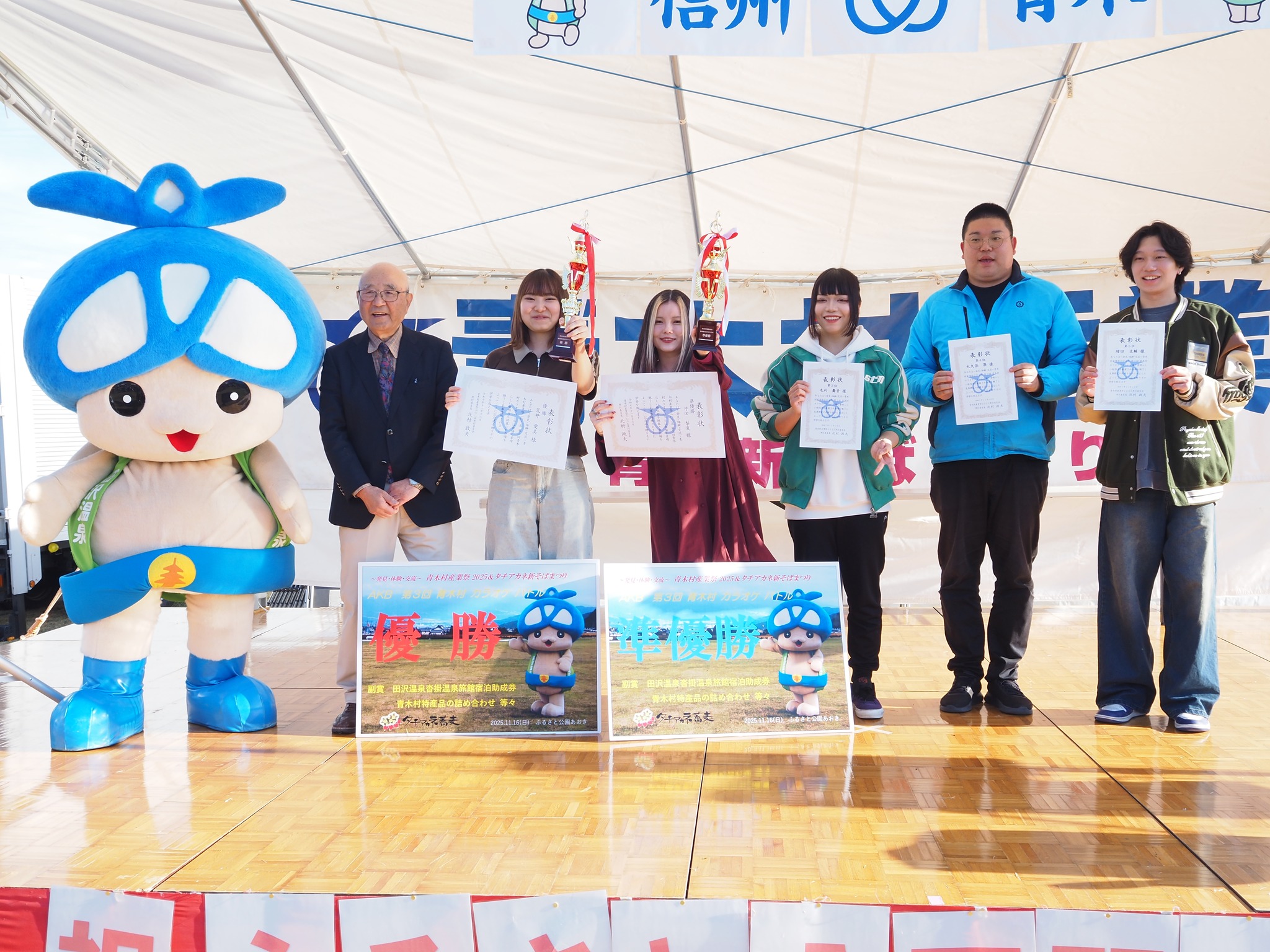 青木村産業祭2025 タチアカネ新そば祭り が11/15(土)・11/16(日)の2日間行われました!11/15(土)には、午前にabn長野朝日放送「駅テレマルシェ」の生中継が行われ、ヤポンスキー小林画伯さんによる産業祭レポートが放送されました!午後には、SBCラジオ 出前中継「マチカラ」が産業祭特設会場から生放送!北村村長をはじめ、様々な青木村のPR放送をして頂きました!11/16(日)には、毎年恒例のステージイベント「第3回 AKB・青木カラオケバトル」が開催され、第1回、第2回の王者が出場する激戦の中、初出場の荒井愛美さんが第3代王者に輝きました!!決勝戦は首位から第3位までの得点差がなんと0.44点という大接戦となりました!出場者の皆さんお疲れさまでした。また来年もお待ちしております!大観衆の中、ダンスチーム「OZ(オズ)」の皆さんのパフォーマンスも素晴らしかったです!!ありがとうございました!!タチアカネ新そば祭りは2日ともに限定500食が早々に完売となりました!早くから並んでくださったみなさまありがとうございました。売り切れで食べられなかった方も多かったようで、申し訳ありませんでした。青木村内にはタチアカネが食べられるお店がたくさんございますので、ぜひまた青木村にお越しください!青木村産業祭2025にお越し頂いた皆様、出店頂いた皆様、運営スタッフの皆様、本当にお疲れさまでした!ありがとうございました!